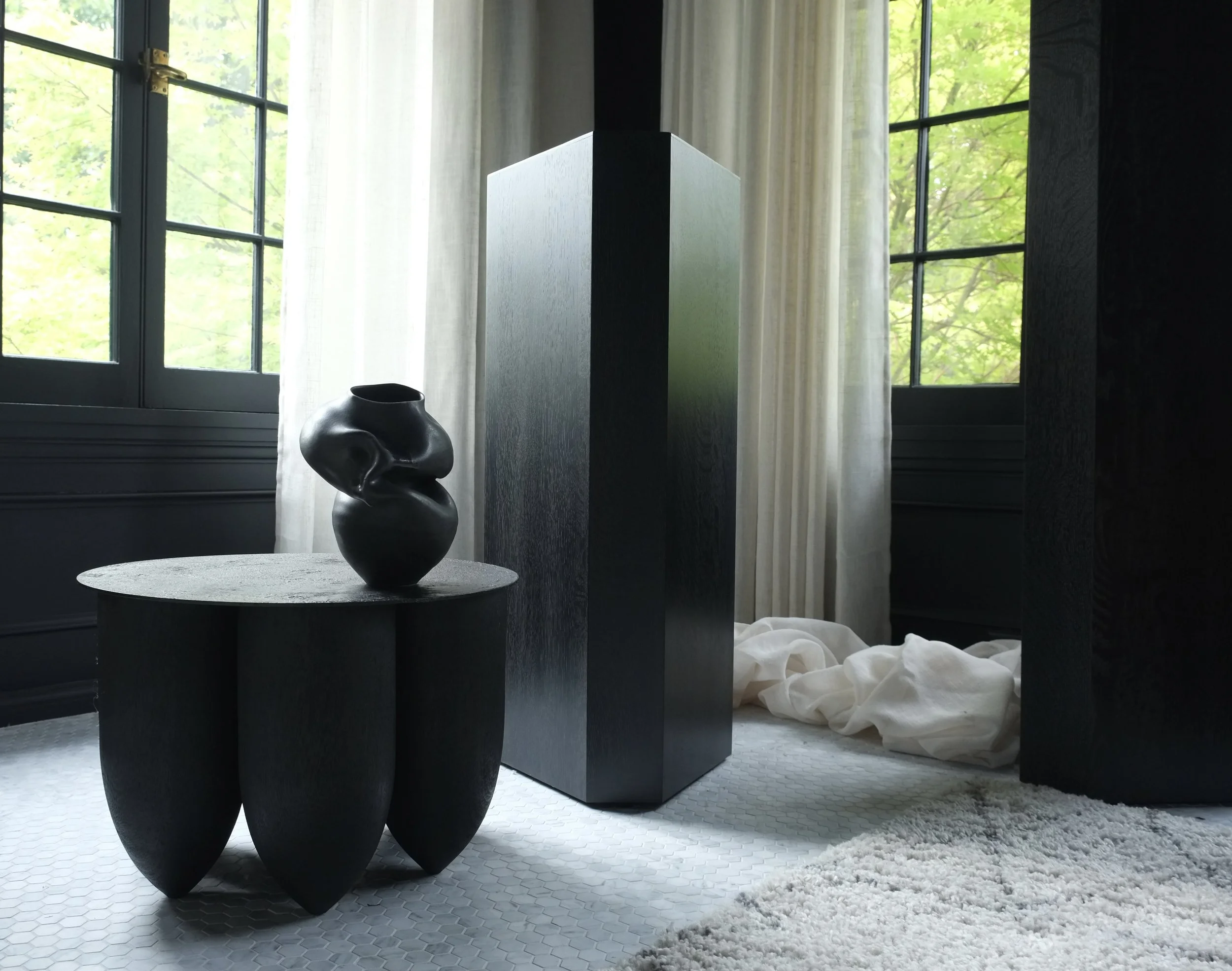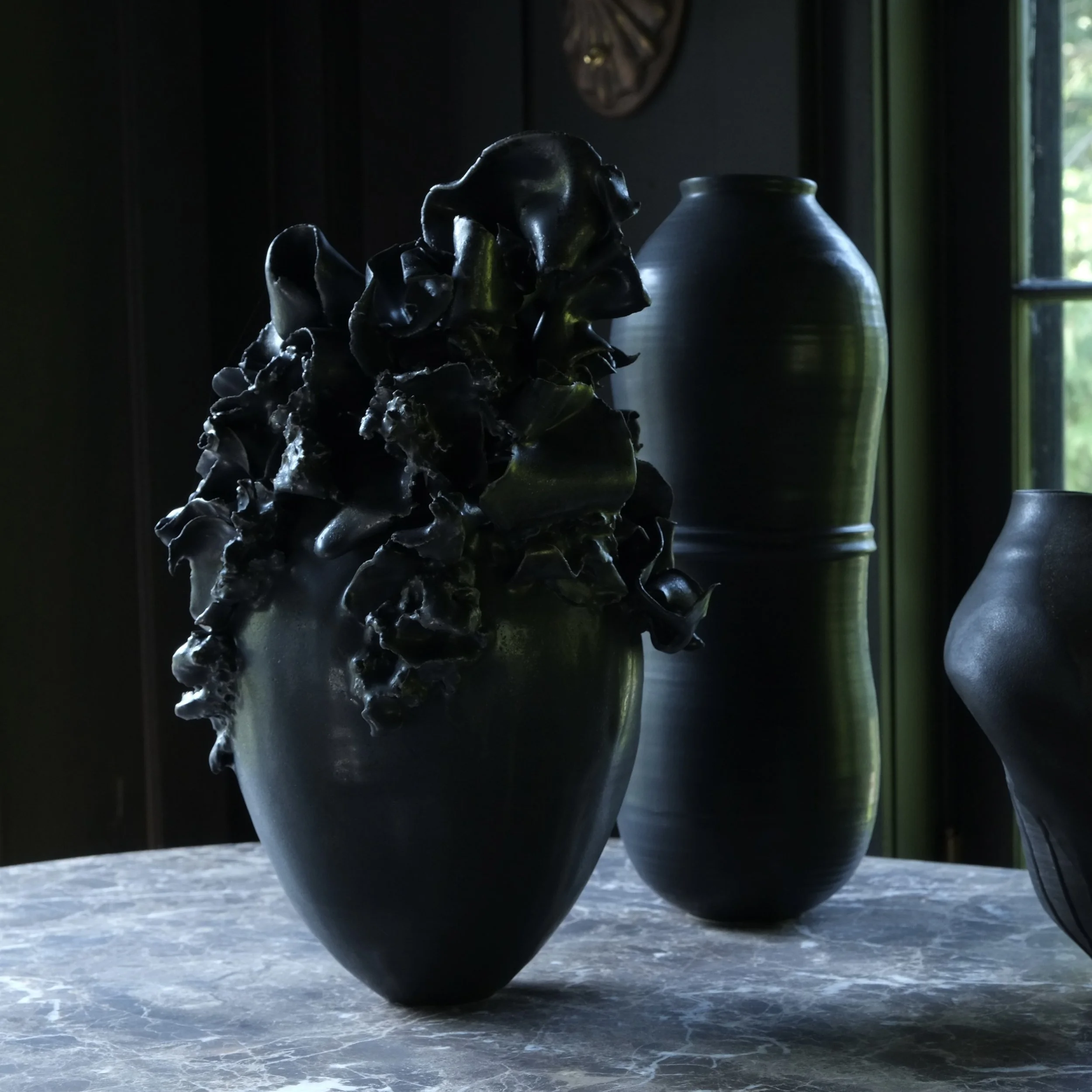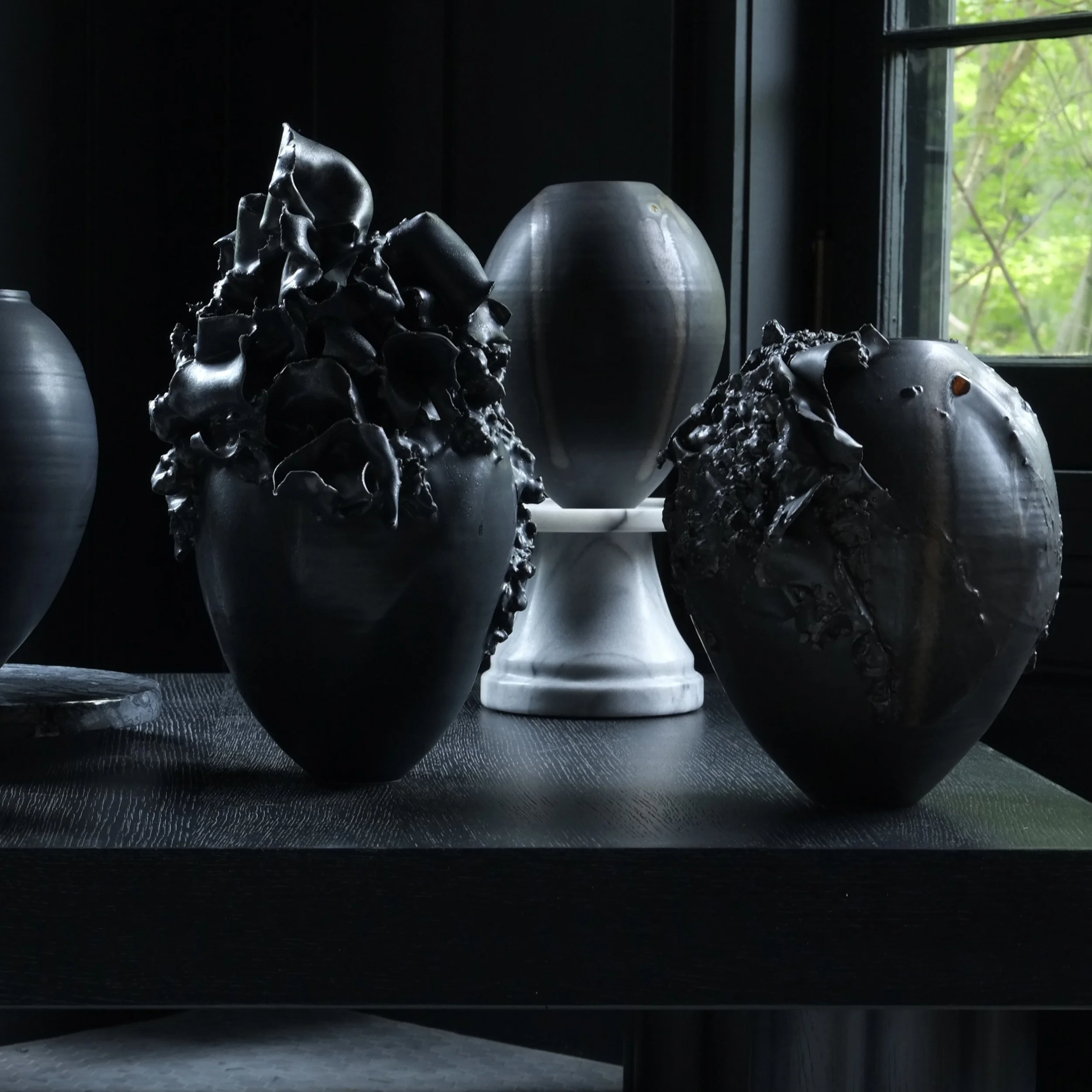 This collection is shaped by experimentation—where layered textures and repeated firings transform each piece in ways that embrace chance and reveal the unexpected, inspired by geological shapes and surface textures.